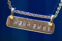 I polished the strip of silver, filed away the rough edges. Then, I took “lettering tools” (I don’t know the name of it in English; in German, it would be “Einschlagbuchstaben”) and hammered my word of the day into the silver surface: HEUREUSE (French for “happy”).